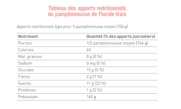 Le saviez vous ? L’apport d’un demi-pamplemousse de Floride permet de couvrir 100% des besoins journaliers en vitamine C et 35% des besoins journaliers en vitamine A d’un adulte. Il participe aussi au maintien des fonctions normales du système immunitaire et apporte de la douceur et de l’acidité aux repas du quotidien, ce qui en fait un complément idéal dans une alimentation saine et équilibrée. Il se déguste chaque année entre novembre et avril (du soleil pendant notre saison froide !). À température ambiante, il se conserve entre 4 à 5 jours et au réfrigérateur, il gardera ses qualités nutritionnelles jusqu’à 3 semaines !
